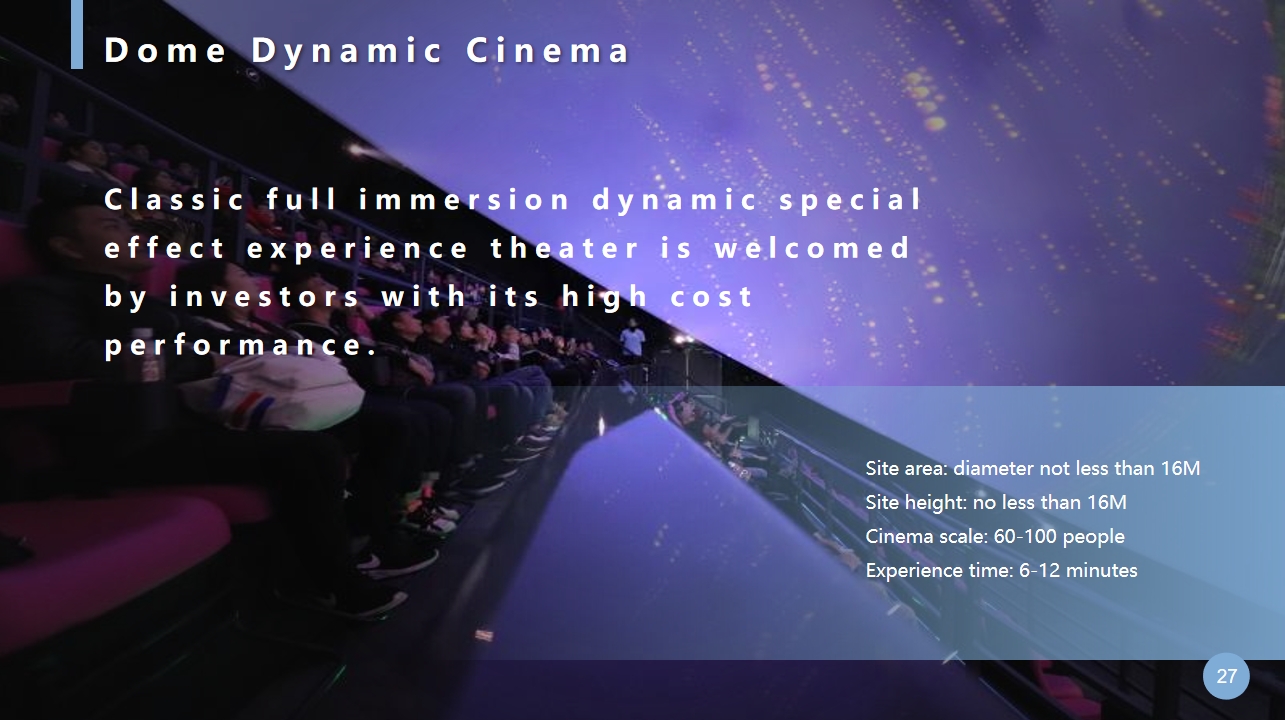 Dome Cinema adopts a 70mm projection device and a hemispherical screen with a diameter of 18 meters. When the audience watches the movie, the entire picture is filled with spheres, ignoring the edges of the screen. The transparent metal screen and six channel stereo effect allow the audience to enjoy a myriad of changes and lifelike atmosphere. The dynamic platform in the cinema is a high-tech system engineering that integrates hydraulic, electrical automation control, and computer animation. When you sit on the platform carrier, the entire carrier can rise and fall, tilt left and right, and pitch back and forth, simulating a spacecraft to invite you to space, or simulating a submersible to enjoy the unique scenery of the underwater world. With realistic visuals and the activity of platform carriers, people involuntarily enter the characters, creating a very realistic and thrilling special feeling.